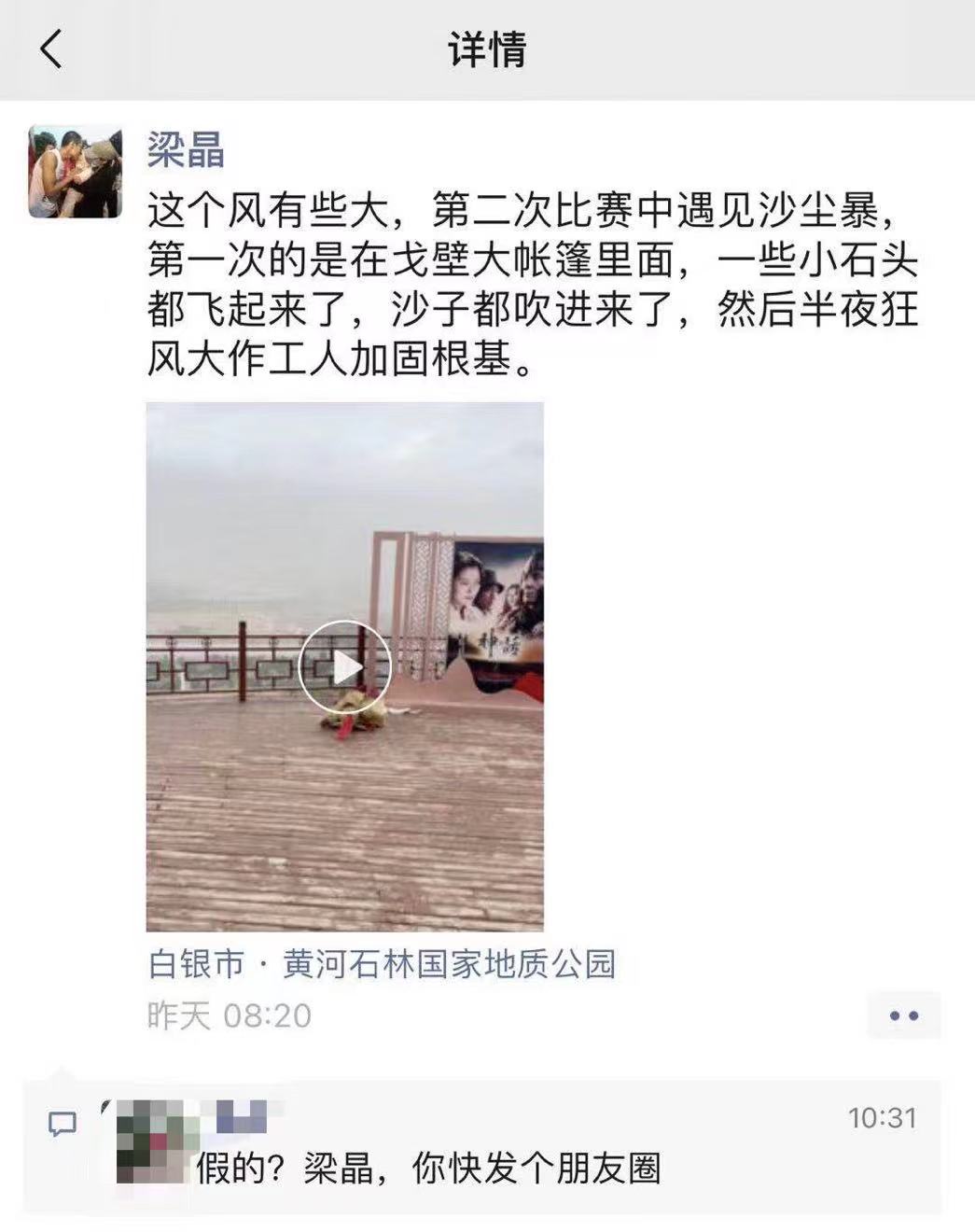 据梁晶友人提供的梁晶的朋友圈信息显示,梁晶最后一条朋友圈发布在5月22日上午8时20分,定位在黄河石林国家地质公园。“这个风有些大,第二次比赛中遇见沙尘暴,第一次的是在戈壁大帐篷里面,一些小石头都飞起来了,沙子都吹进来了,然后半夜狂风大作工人加固根基。”在该朋友圈中,梁晶还发布一个视频,视频中,电视剧版《神话》的一个户外装置被风吹倒,“你看这个风多大。”梁晶在视频中说。