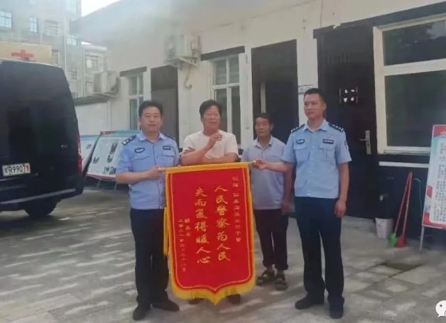2021年6月28日,南阳市四里店镇群众胡某将一面“人民警察为人民、失而复得暖人心”的锦旗送到四里店派出所民警手中,感谢民警快速破获盗窃案件,抓获犯罪嫌疑人马某,帮助自己挽回财产损失。
