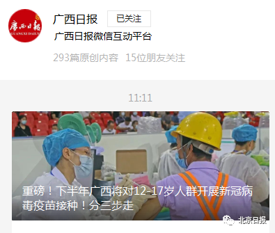 今天,广西日报发布消息称,根据党中央、国务院新冠病毒疫苗接种工作的总体部署,下半年广西壮族自治区将对12-17岁人群开展新冠病毒疫苗接种。