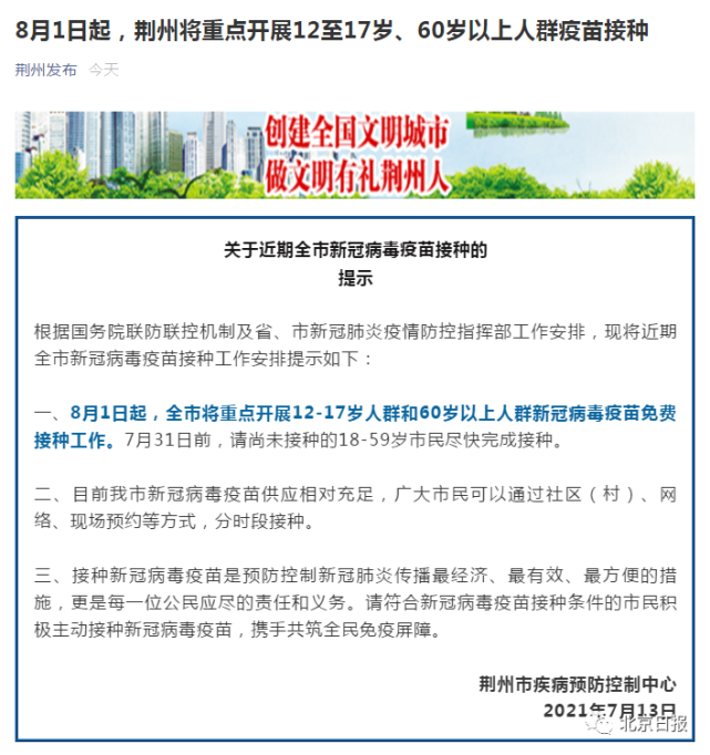 提示中提到,8月1日起,荆州市将重点开展12-17岁人群和60岁以上人群新冠病毒疫苗免费接种工作。7月31日前,请尚未接种的18-59岁市民尽快完成接种。