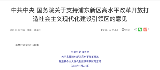 在他履新前,7月15日,新华社发布了《中共中央 国务院关于支持浦东新区高水平改革开放打造社会主义现代化建设引领区的意见》。