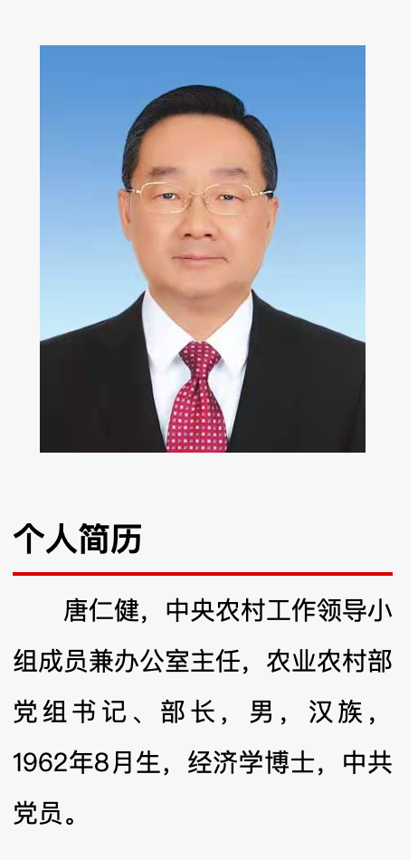 2020年11月,时任甘肃省省长唐仁健进京,履新农业农村部党组书记、部长,同时,他还成为中央农村工作领导小组成员兼办公室主任。