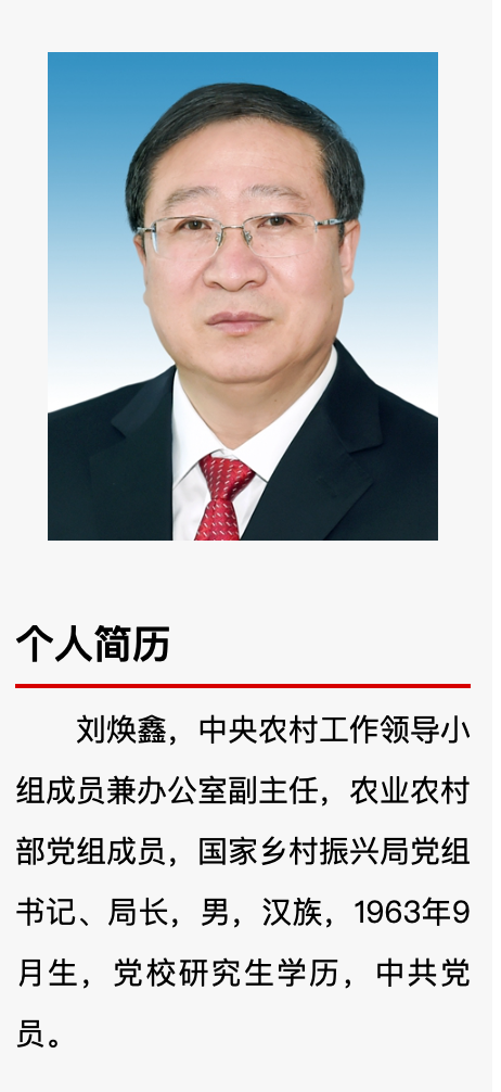 2021年4月,农业部党组成员、副部长刘焕鑫履新中央农村工作领导小组办公室副主任。2021年11月,他担任国家乡村振兴局党组书记、局长。
