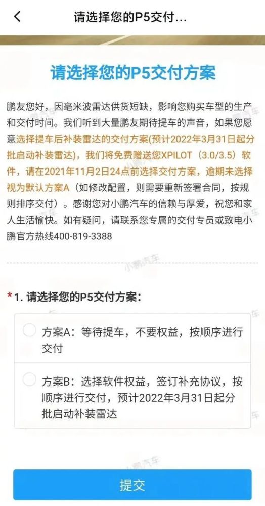 另外,还有造车新势力也做出了“减配交付”的动作。10月份,小鹏提供A or B交付方案,供车主选择。即“先提车后补装雷达”或是“分批启动雷达补装并免费赠送XPILOT(3.0/3.5)软件”;理想则提供先交付安装1个前正向和2个后角毫米波雷达的“3雷达车型”,后期为用户进行免费补装的方案。