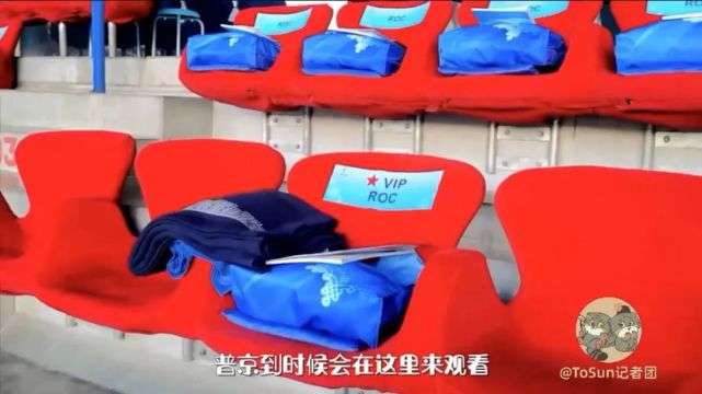 画面中出现的ROC是俄罗斯奥委会(Russian Olympic Committee)的英文缩写,前排标明“VIP”的座位就属于普京。座位上放着毯子、请柬、节目册还有一个手提袋。