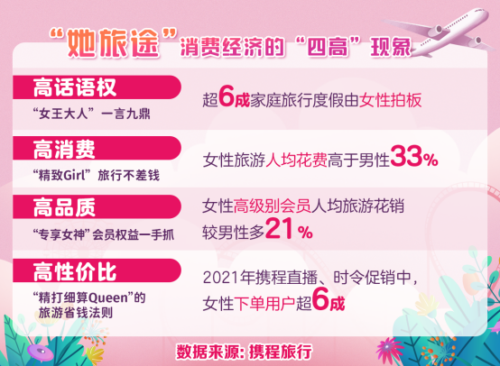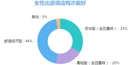 随着女性教育、收入水平提高带来的消费意识崛起,促使女性更加注重生活质量与品位。携程“她旅途”消费报告显示,女性旅游更舍得花钱。2021年女性为旅游支付的人均花费高于男性33%;超四成女性选择入住4星级以上酒店。