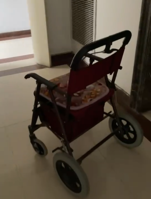 因为怕影响其他人乘坐电梯,王芬决定爬楼梯,一层楼一层楼地找,终于在六楼找到了奶奶的推车。