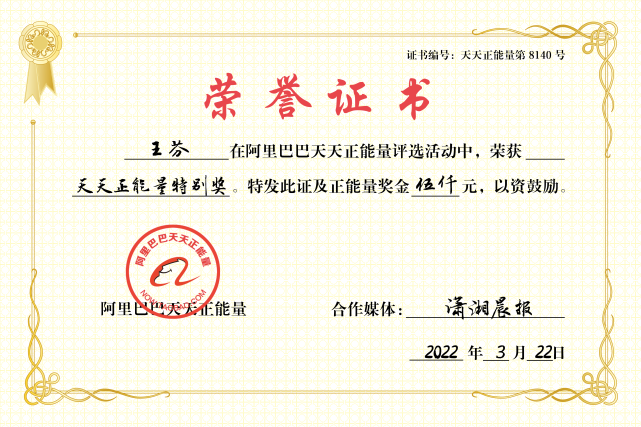 3月22日,潇湘晨报联合阿里巴巴天天正能量为王芬颁发天天正能量特别奖及5000元奖金,点赞她关怀老人的善举。“天天正能量”在王芬的颁奖词中这样写道: