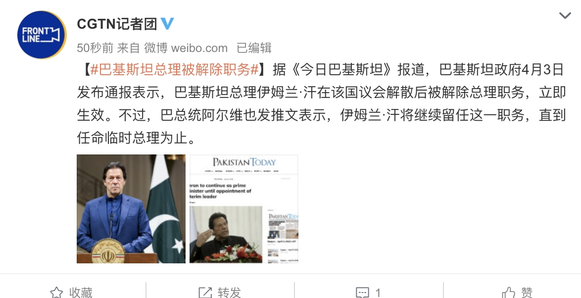 据《今日巴基斯坦》报道,巴基斯坦政府4月3日发布通报表示,巴基斯坦总理伊姆兰·汗在该国议会解散后被解除总理职务,立即生效。不过,巴总统阿尔维也发推文表示,伊姆兰·汗将继续留任这一职务,直到任命临时总理为止。