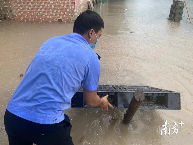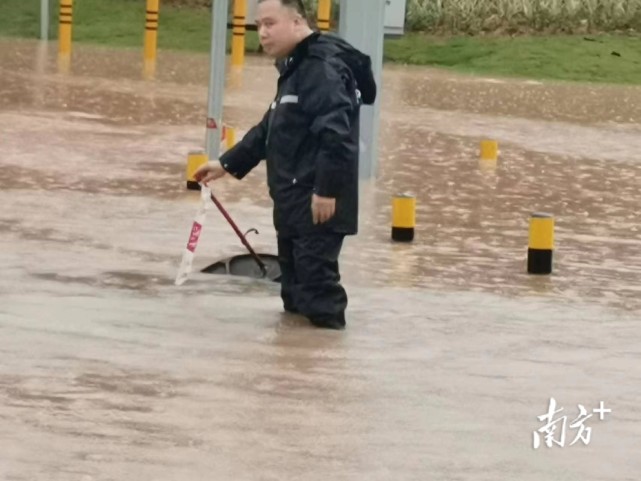 当天下午,仲恺区公安分局潼湖派出所驻村警力陈志强在开展驻村工作的途中,发现辖区一处积水较高,此时仲恺区已是暴雨红色预警信号,再不处理容易发生大面积深度积水。为此,陈志强凭借记忆,借助工具逐个排查排水井盖,清理其中的垃圾,加快排水。同时,在井盖周边做好防范,提醒群众安全绕行。