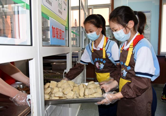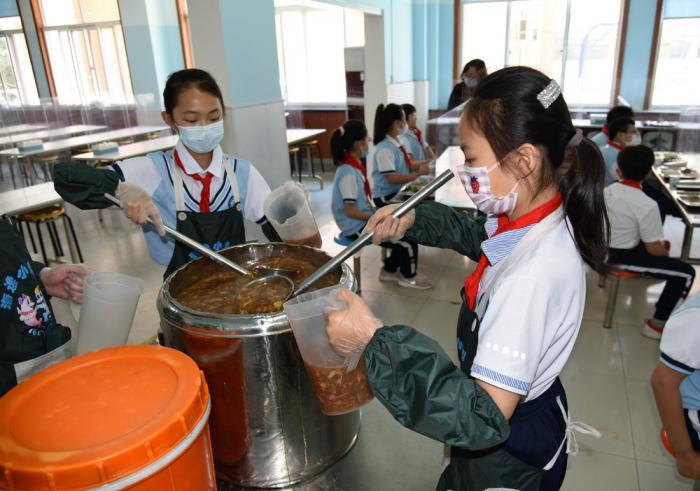 5月24日,青岛海逸学校的“小帮厨”在餐厅为同学提供服务。近期,青岛市教育部门加强学生劳动教育方面的培养,努力构建德智体美劳全面培养的教育体系,在潜移默化培养学生劳动技能、养成劳动习惯的同时,让孩子们体会到劳动带来的快乐与满足。