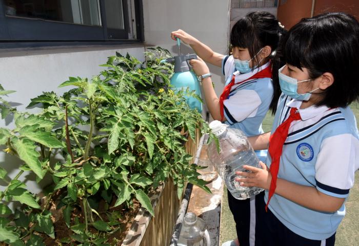5月24日,青岛海逸学校的学生在为班级种植的蔬菜浇水。该学校为每个班配备了菜箱让学生体验种植的乐趣。