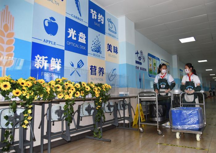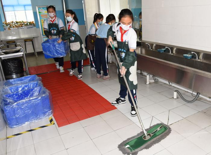 5月24日,青岛海逸学校的“小帮厨”在同学们用餐后打扫餐厅。