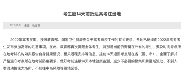 政知君注意到,就在5月21日,教育部提醒全体考生,特别是仍滞留在外省的考生,要求“及时向考点所在地考试机构如实报告自身健康情况、相关返程安排等信息,提前14天返回考点所在省(区、市)”。