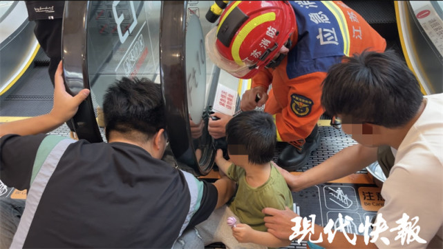 日前,盐城东台某商场内,一名熊孩子贪玩,右手不慎被卡进电梯扶手缝隙。