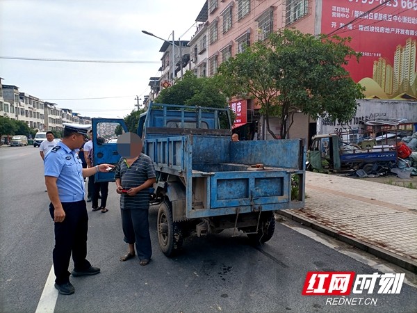 6月15日,隆回县公安局交通警察大队民警在雨山路段开展交通问题顽瘴痼疾集中整治时,发现一辆拖拉机由南往北驶来,民警便马上将其拦停至安全地点实施检查。