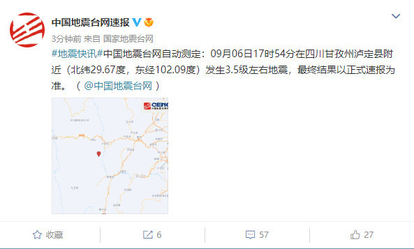 中国地震台网自动测定:09月06日17时54分在四川甘孜州泸定县附近(北纬29.67度,东经102.09度)发生3.5级左右地震,最终结果以正式速报为准。