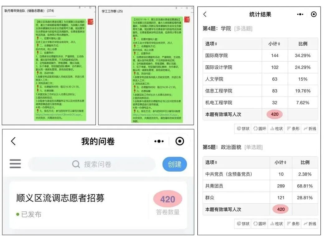为保证流调工作顺利开展,牢牢把握防控工作主动权,团区委立即响应,快速集结,第一时间与北京城市学院、北京工业大学耿丹学院团委取得联系,招募青年志愿者协助开展流调工作。动员令发出仅半小时,400余名来自各院系的大学生踊跃报名。按照优中选优的标准,最终50名学生从中脱颖而出,连夜组建起流调“青年突击队”,火速投入到这场与病毒赛跑的紧张战斗之中。
