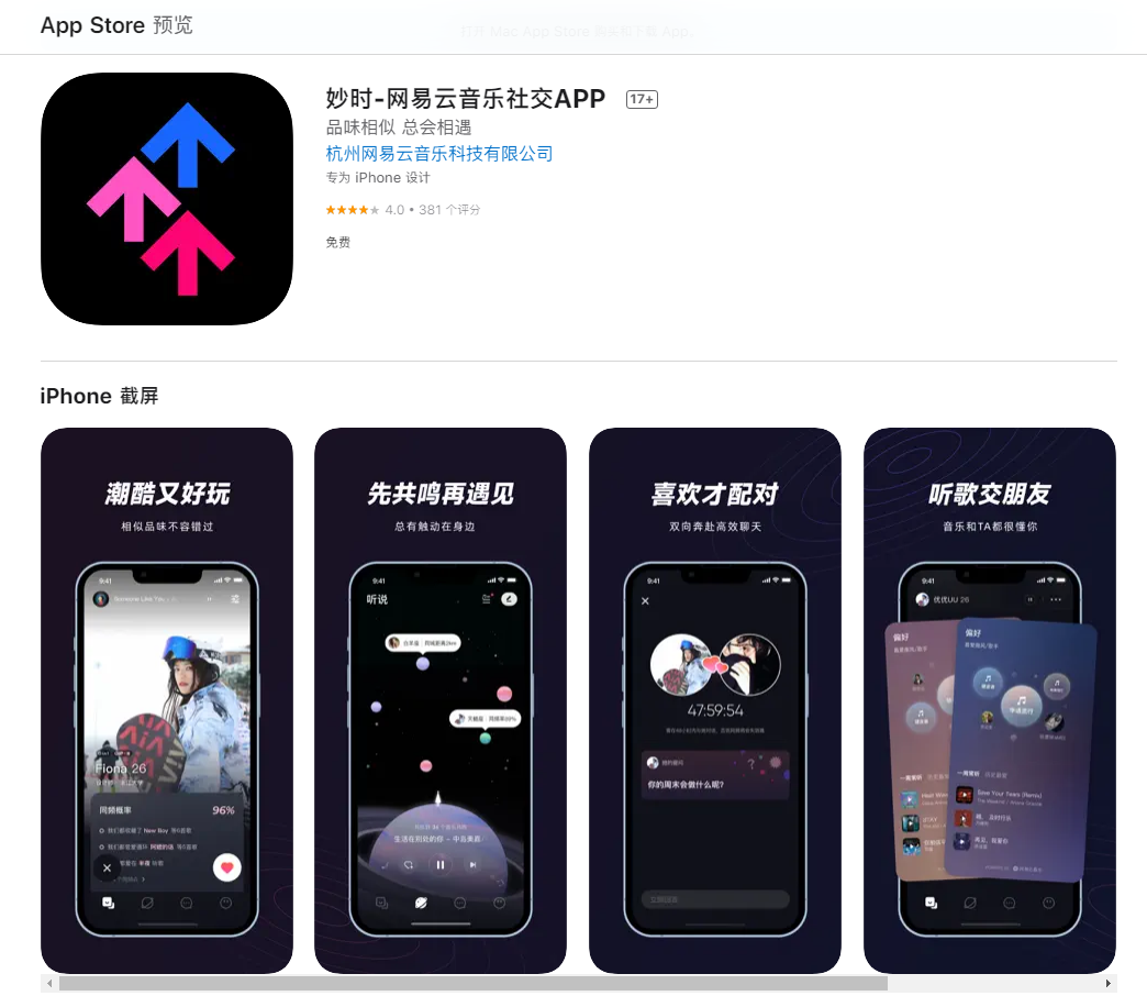 12月4日,一款名为妙时的音乐社交软件在苹果应用商店上架,这款软件由网易云音乐科技有限公司出品,为网易云音乐社交APP,这款软件的前身正是MUS。今年的9月27日上午,网易云的首款音乐社交软件MUS开放注册,以“音乐连接你我”为标签,其推广宣传语有“颜值高还聊得来”“喜欢才配对,双向奔赴高效聊天”“解析音乐性格,听歌大数据智能匹配”等,但是27日下午官方就宣布将延迟开放,当晚MUS急匆匆从应用市场下架,官方宣布为基于整体运营目标考虑,MUS暂时做下架处理,后续会进步优化产品体验。