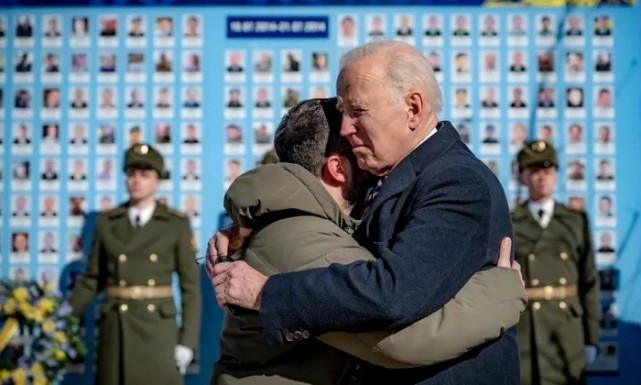 当地时间2月20日,乌克兰首都基辅,泽连斯基和拜登在乌阵亡将士纪念墙献花圈仪式上互相拥抱 图源:《卫报》
