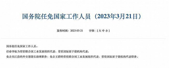 任命李松为常驻联合国工业发展组织代表、常驻国际原子能机构代表。