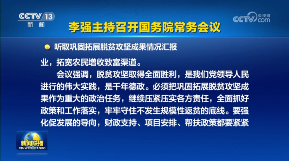 据央视报道,3月24日,国务院总理李强主持召开国务院常务会议,这次会议的一个议题,就是听取巩固拓展脱贫攻坚成果情况汇报。