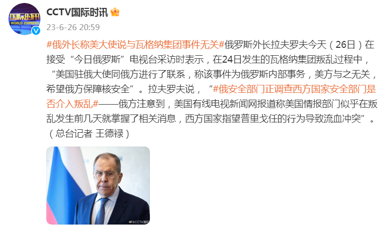 俄罗斯外长拉夫罗夫今天(26日)在接受“今日俄罗斯”电视台采访时表示,在24日发生的瓦格纳集团叛乱过程中,“美国驻俄大使同俄方进行了联系,称该事件为俄罗斯内部事务,美方与之无关,希望俄方保障核安全”。拉夫罗夫说,“俄安全部门正调查西方国家安全部门是否介入叛乱——俄方注意到,美国有线电视新闻网报道称美国情报部门似乎在叛乱发生前几天就掌握了相关消息,西方国家指望普里戈任的行为导致流血冲突”。(总台记者 王德禄)