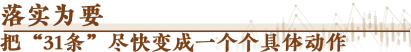 一分部署,九分落实。“31条”的最后三条,就是关于组织实施的要求。围绕“31条”,“1+N”配套措施里的“N”,即将陆续公布,令人期待。
