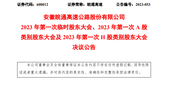 11月9日,皖通高速在位于合肥市望江西路的公司会议室召开了2023年第一次临时股东大会、2023年第一次A股类别股东大会及2023年第一次H股类别股东大会。