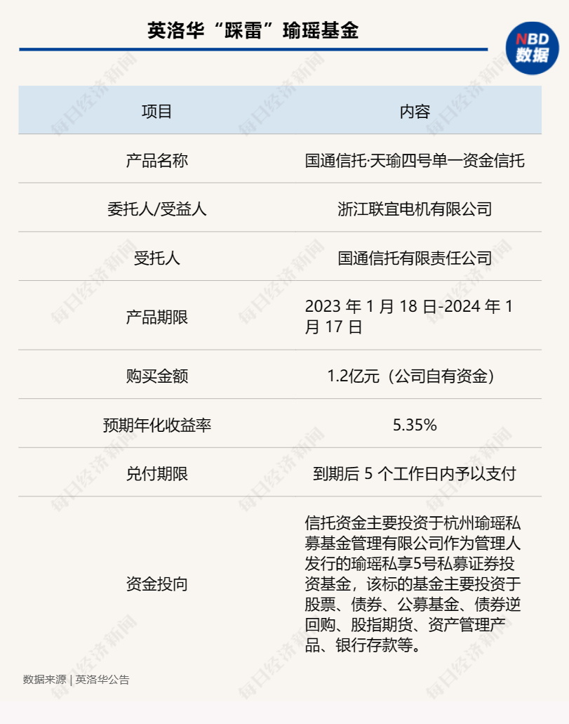 11月25日,英洛华发布公告称,公司的全资子公司浙江联宜电机有限公司(下称“联宜电机”)购买的1.2亿元国通信托产品仅收回436.92万元,所购买信托理财产品存在兑付风险。