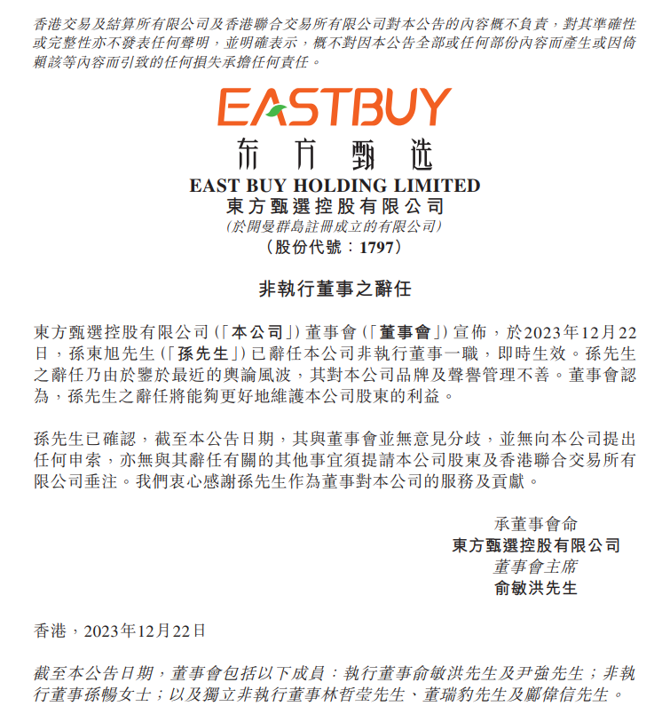12月22日晚间,东方甄选在港交所公告,公司董事会宣布,孙东旭已辞任本公司非执行董事一职,即时生效。公告称,孙东旭辞任是由于鉴于最近的舆论风波,其对本公司品牌及声誉管理不善。董事会认为,孙东旭之辞任将能够更好地维护本公司股东的利益。