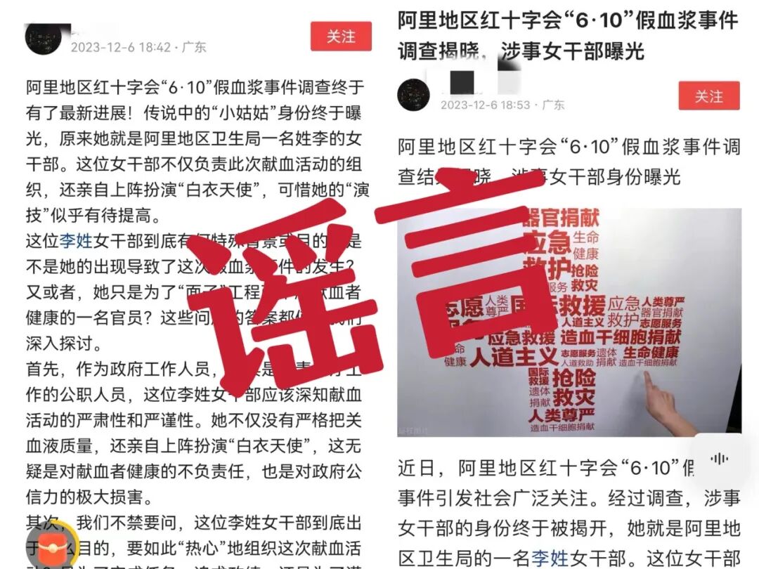 “西藏网警”接网民举报,有网民在网络平台发布“阿里地区红十字会‘610’假血浆事件调查揭晓,涉事女干部曝光,其身份为阿里卫健部门李姓干部”信息,引发网民关注。经公安机关向阿里红十字会和卫健部门核查,阿里红十字会未在6月10日组织献血活动,卫健部门也没有所谓的“李姓女干部”,该网民所发贴文系杜撰的虚假信息。