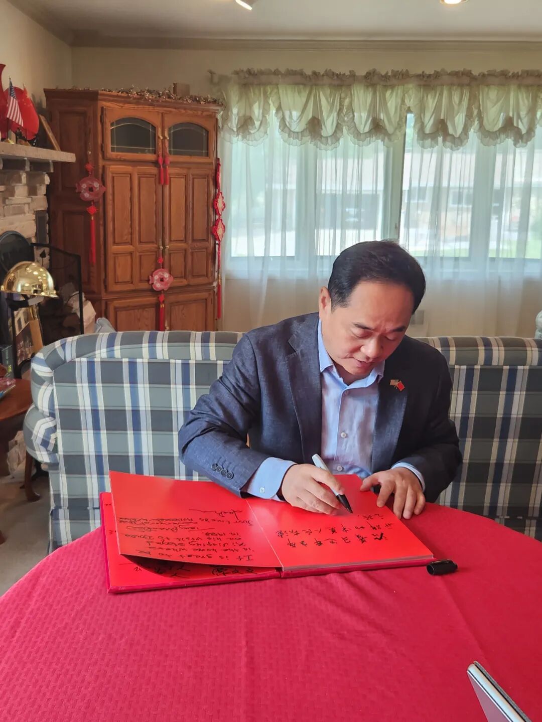 杨万明会长走进中美友谊屋,一边仔细端详屋内陈列的照片,一边与陪同的房东德沃切克后人共同回忆习近平1985年和2012年两次访问马斯卡廷的温暖场景。杨万明会长深有感触地对老朋友说,我们一定要守护好、讲述好这段中美人民友谊的珍贵历史,以此鼓励更多两国民众投身中美人民友好事业。参观结束前,杨万明会长在留言簿上写到:沿着习近平主席开辟的中美人民友谊之路,将中美人民友好事业不断发扬光大!