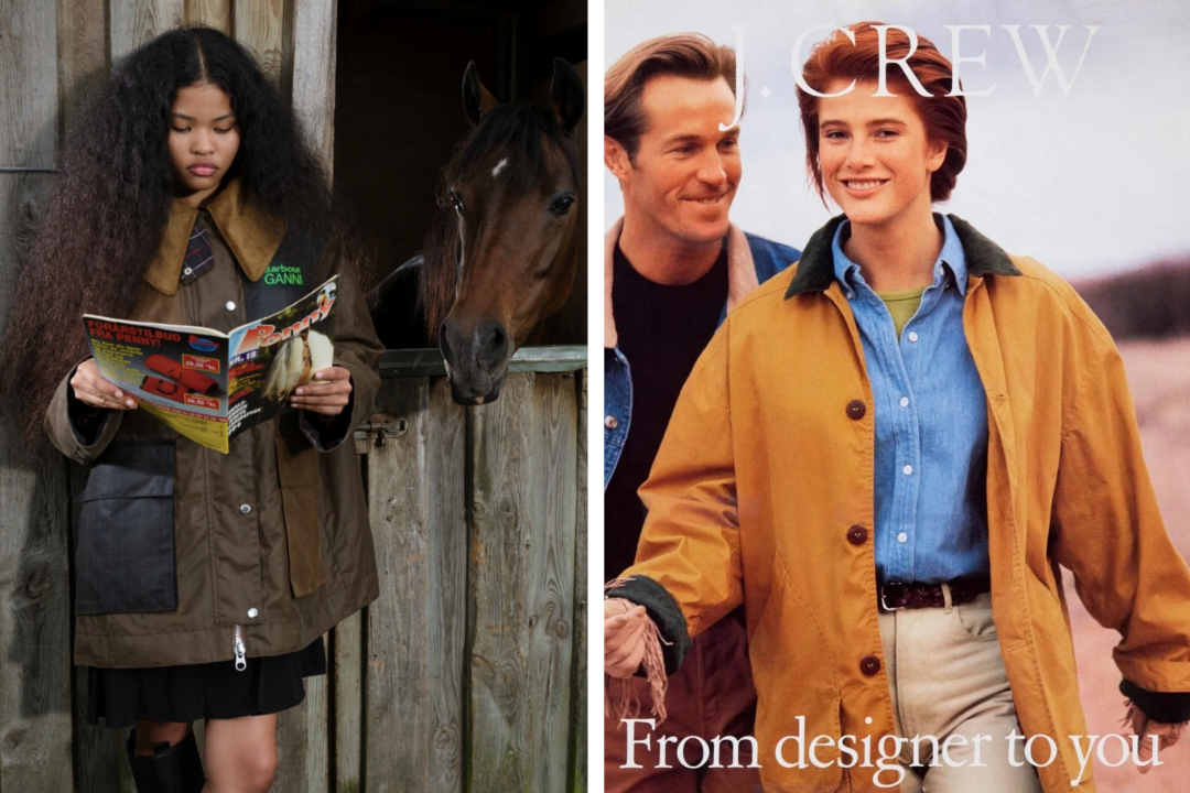 巴恩风即barn(谷仓)的音译,起源于美国西部农场工人劳作穿的服装,在当下的流行趋势中,属于松驰且不羁的穿搭风格。90年代的barn jacket采用更加靓丽的黄色叠穿牛仔,毫不过时的复古穿搭。