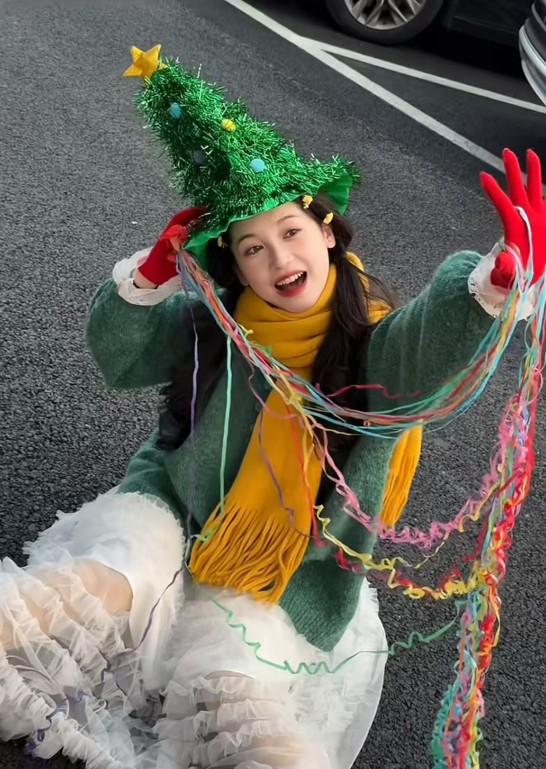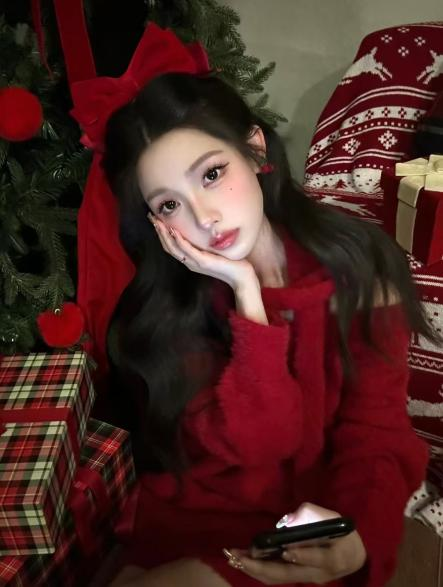 浪漫的圣诞月必须要搭配一套浪漫温柔风的圣诞穿搭,必不可少的红色系,一件斜肩款红色毛衣裙,搭配同色系腊肠围巾,一双红色系的袜子在幽绿的圣诞树旁边,红色与绿色的碰撞是一场奇妙的视觉体验。红色的立体蝴蝶结发夹也是从22年火到了24年,超出片的发饰快达到人手一个了,跟半扎发的大波浪造型适配度满分,甜蜜得如同平安夜的苹果。
