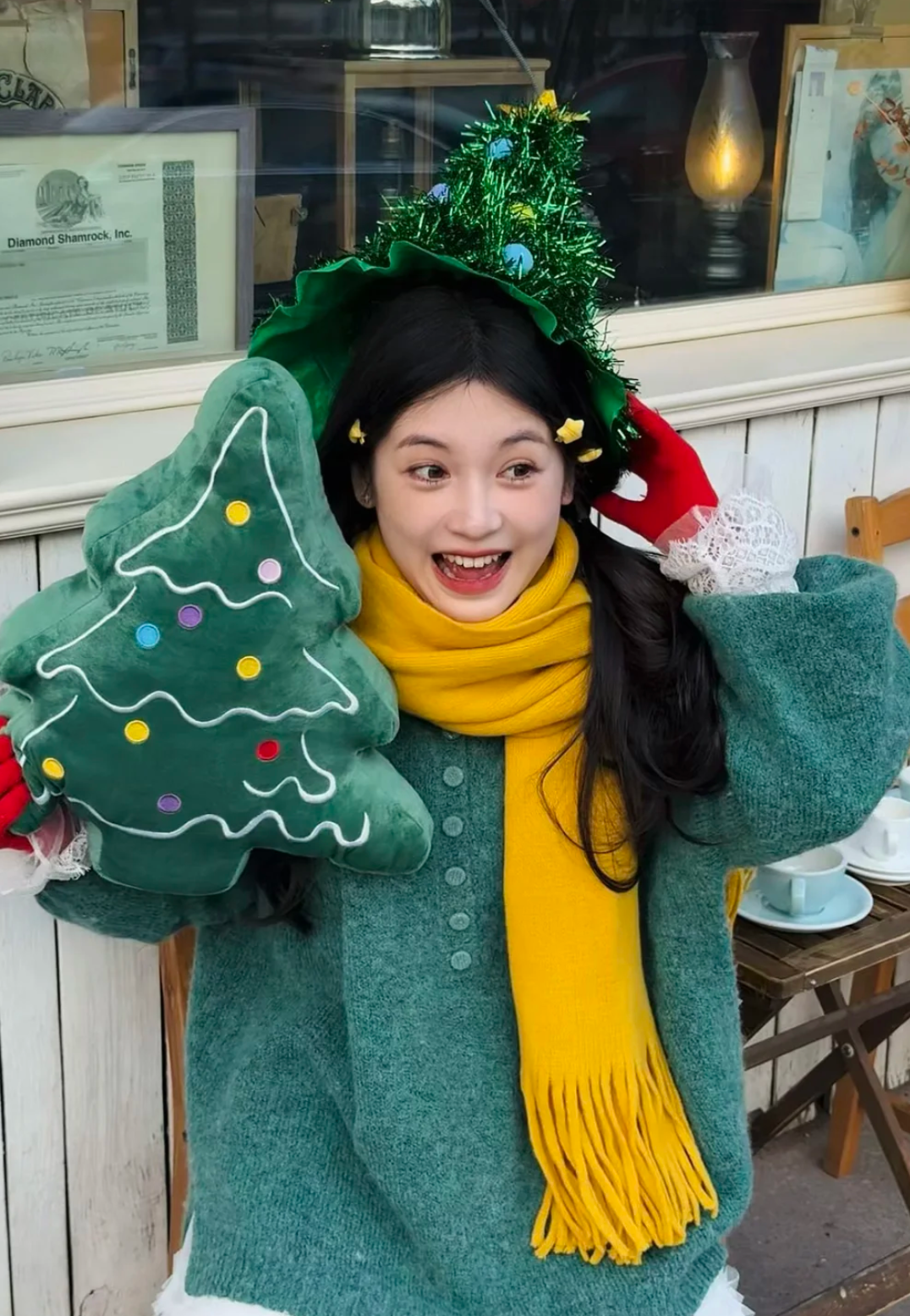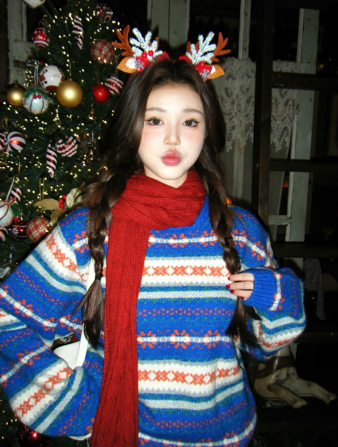 拍照出片不仅靠pose,一些出片的氛围感神器也必不可少,圣诞元素的麋鹿发箍,跟后面的圣诞树相称,复古的环境与复古的穿搭犹如置身千禧年的美国圣诞节。当然帽子也是出片秘诀之一,一顶圣诞气息浓厚的红色帽子让画面的视觉中心更加明显,亮度也有了显著提升。