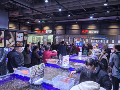 在服务方面,门店学习了胖东来在细节上的温度,为特殊群体提供放大镜和血压测量仪等设施,为宠物设置了专门的寄存处,休息区提供微波炉、直饮水、冰袋、纸巾、吸管等,在生鲜区为厨艺新手提供烹饪小贴士,还新增了海鲜加工厨房,满足顾客现场加工烹饪的需求。