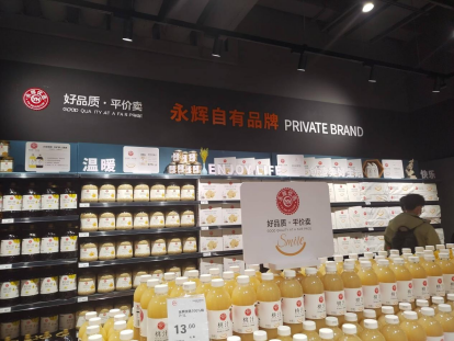 此外,门店还特别设置了胖东来自有品牌商品区和永辉自有品牌商品区,主要售卖相关自有产品。据工作人员介绍,其中,永辉自有的烘焙品牌“YH Bakery”榴莲千层蛋糕是北京、福州、遵义等部分调改店开业阶段的单品销冠;“永辉优选”自有品牌果汁刚刚获得PLF金星奖,是全球零售自有品牌产品亚洲展颁发的专业奖项。