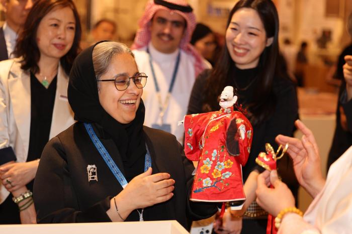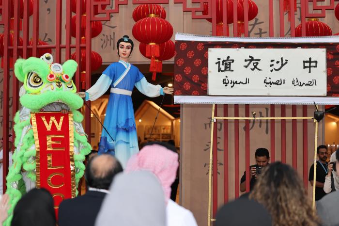 11月13日,在沙特首都利雅得,嘉宾在第三届沙特阿拉伯国际手工艺周中国馆欣赏木偶。