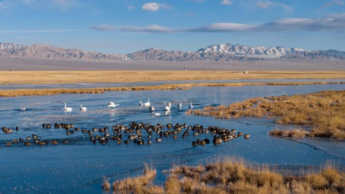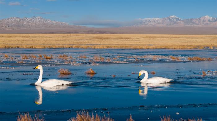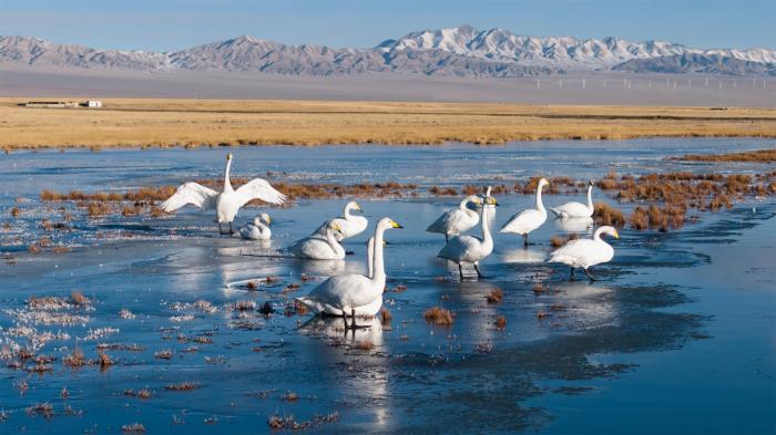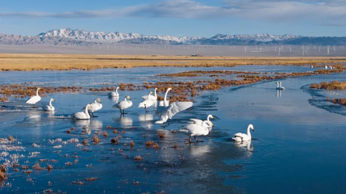 视窗|甘肃阿克塞:湿地冰湖天鹅舞