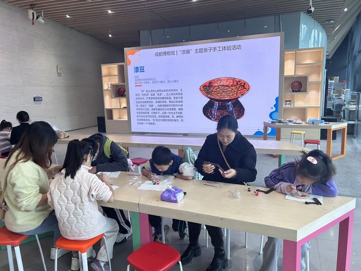 成都博物馆结合精品藏品,设置了各类体验活动。有的学生持笔为“漆盘”模具上色,有的学生为“画像砖”装饰纹样,还有学生聚精会神地制作手工皮影……
