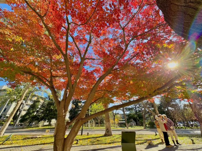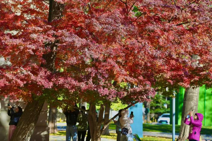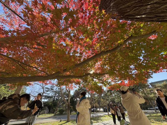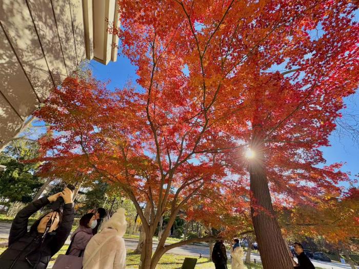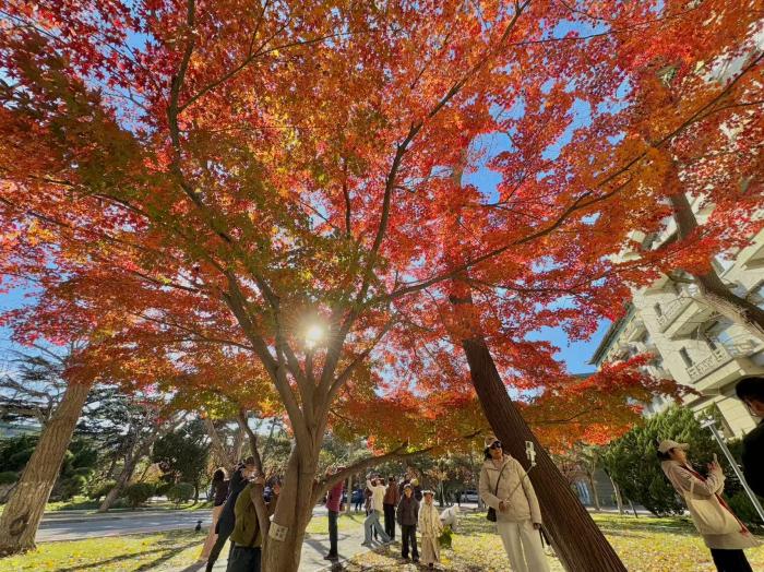 现场可见,市民们或举着手机捕捉红叶特写,或结伴在树下合影,不少人特意穿着浅色系衣物搭配红枫取景。