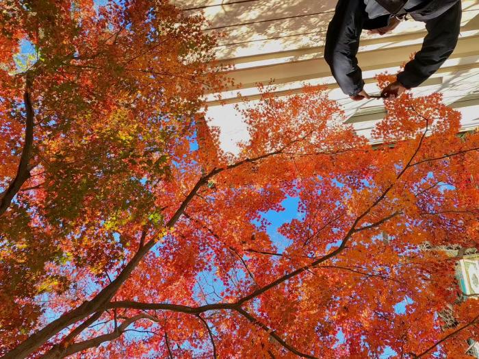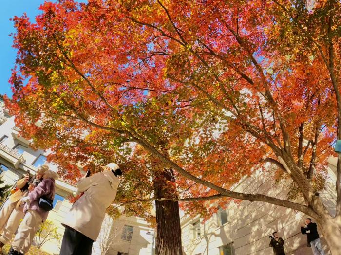 这棵走红的红枫藏身庭院之中,上世纪八十年代栽种,树型舒展、枝叶繁茂,与具有年代感的建筑相映成趣。