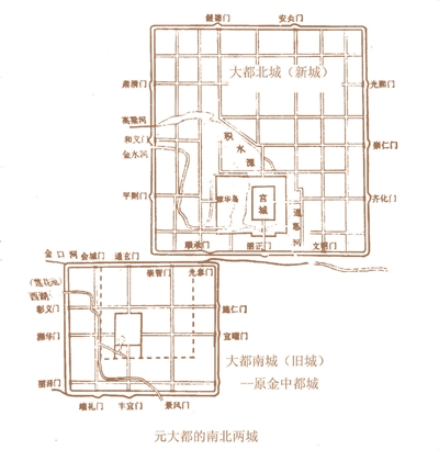1271年,忽必烈称帝,发布《建国号诏》法令,取《易经》中“大哉乾元”之意 ,正式建国号大元。次年,忽必烈改元中都为元大都。至元二十四年(1287),筑城工程全部告成。大都新城建成后,元大都的范围包括南北两城,一个是原燕京城,称旧城或南城;一个是在中都城东北的新城。新旧二城的民事仍由左、右警巡院统一管理。自此,一座雄伟壮丽、举世无双的都城矗立在华北大平原的北端,并随着城市经济的迅速繁荣,对外交流的日趋频繁,发展成为驰名世界的大都市。