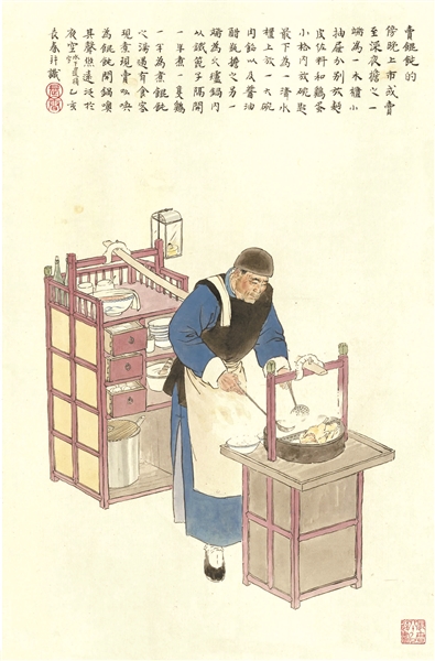 早年间,馄饨是老北京冬日的吃食,其他季节相对较少。《清稗类钞》载:“馄饨以薄面为皮,有襞积(皱纹),人呼之曰绉纱馄饨,取其形似也。”京城馄饨以皮薄馅香、汤汁味美闻名,尤其是冬季,在路边的馄饨摊儿热热地吃一碗下肚,顿觉暖心寒消。杨静亭《都门杂咏》云:“包得馄饨味胜常,馅融春韭嚼来香。汤清润吻休嫌淡,咽后方知滋味长。”而卓然在《故都食物百咏》云:“馄饨过市喊开锅,汤好无须在肉多。今世不逢张手美,充饥谁管味如何!”其中的“张手美”为五代后周时开封城外一位有名的商贩。
