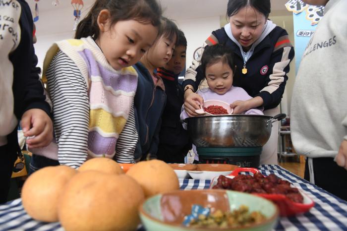 唐代诗人王维用《九月九日忆山东兄弟》描绘此时心境:“独在异乡为异客,每逢佳节倍思亲。遥知兄弟登高处,遍插茱萸少一人。”重阳节自古就有佩戴茱萸、饮菊花酒、登高祈福等习俗,如今更是一个传承尊老敬老文化的节日。10月28日重阳节前夕,在河北省邯郸市广平县第四幼儿园,老师指导小朋友学习制作重阳菊花茶。新华社发(程学虎摄)