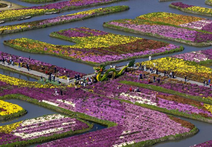 11月6日,人们在江苏泰州兴化市千垛景区赏菊游玩(无人机照片)。新华社发(汤德宏摄)