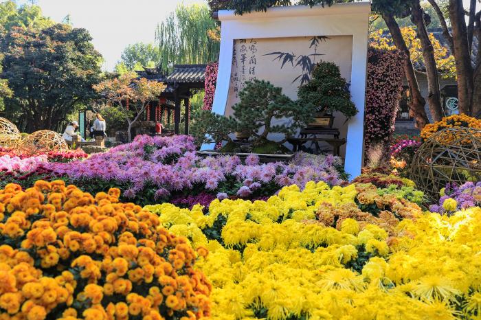 11月10日,人们在江苏扬州个园景区“菊隐个园,四时闲趣”为主题的精品菊展上赏菊游玩。新华社发(齐立广摄)