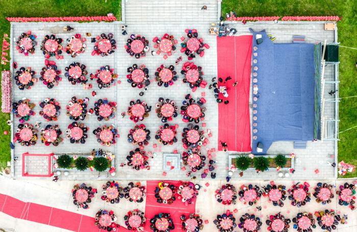 10月29日重阳节,老人们在湖北省秭归县两河口镇太坪村参加长寿宴(无人机照片)。新华社发(王罡摄)