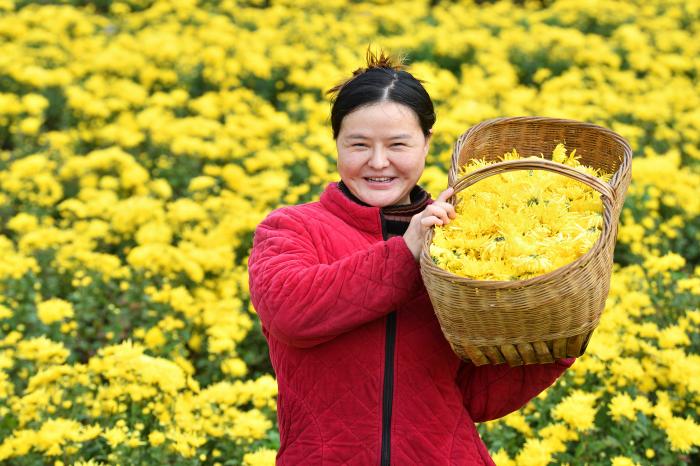 11月3日,在湖北省襄阳市保康县黄堡镇黄堡村菊花种植基地,村民展示采摘的金丝皇菊。新华社发(杨韬摄)